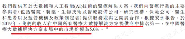 根据安永的报告,以2019年的收入计算,医渡科技在中国所有医疗大数据解决方案提供商中排名第一,但即便是这个领域的龙头老大,医渡科技的市场份额也不过才5%,说明这个市场还是有很多机会去试、去闯的。