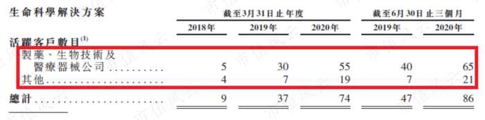 截至2020财年一季度末,制药、生物技术及医疗设备公司客户数有65个,其他类型的客户数只有21个。(注:医渡科技的财年是从每年的4月1日开始计算,2017财年是指2017年4月1日至2018年3月31日。)