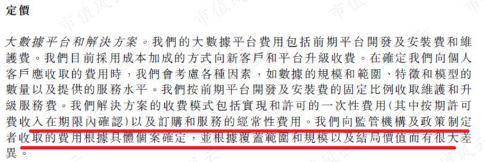 那么,卖给监管机构的大数据平台,是标准化的产品吗?显然也不是,公司自己说向监管机构收取的费用,会根据具体个案确定,不同案例会有不同的定价,这无疑是非标准化的定价模式。