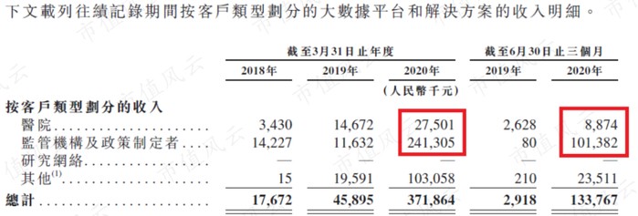 但是从收入贡献程度看,监管机构明显是大数据平台和解决方案收入的最主要来源,尤其是2019财年和2020财年一季度,来自监管机构的收入分别为2.4亿和1亿元,分别占同期大数据平台和解决方案收入的64.9%和75.8%。