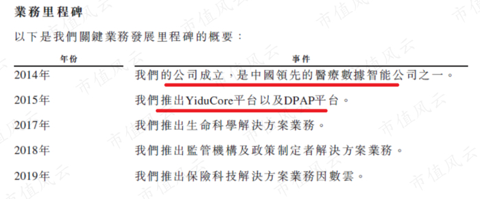 从公司的发展历程上看,医渡科技的业务形态分了两步走,第一步是自主研发和建立一个大数据分析平台——YiduCore(医渡云),并以此作为公司拓展业务的基础设施。