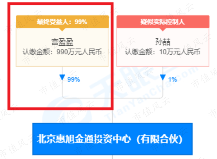 根据天眼查APP的资料,目前宫盈盈依然持有北京惠旭金通投资99%的有限合伙人权益,执行事务合伙人则为孙喆。