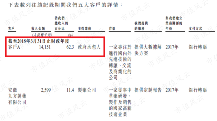 例如,2017财年,医渡科技的第一大客户就是政府承包人,光这一个政府承包人,就贡献了公司62.3%的营业收入。