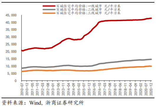 据wind数据统计,2010年7月至2020年12月,一线城市的平均住宅价格从20000元/平方米涨到了近45000元/平方米,年化回报率超过12%;二三线城市的平均住宅房价年平均涨幅也达到近10%。