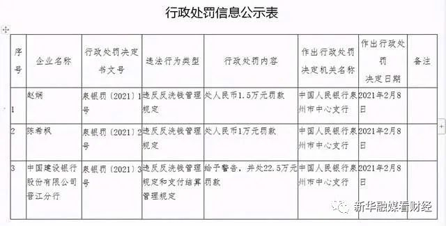 同日,该行晋江分行也因违反反洗钱管理规定和支付结算管理规定,被中国人民银行泉州市中心支行给予警告,并处22.5万元罚款。