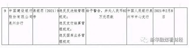 2月20日,中国人民银行行政处罚信息公示表显示,建设银行泉州分行因存在违反反洗钱管理规定、违反支付结算管理规定、违反国库业务管理规定的违法违规行为,遭央行泉州市中心支行警告,并罚款82万元。
