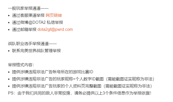 在这个公告中,完美世界开通了一个给玩家们的 “ 举报渠道 ” ,并且详细说明了举报格式和举报方式,充满了求生欲。