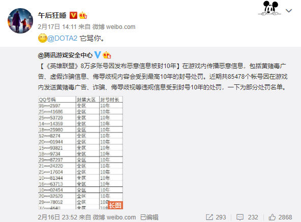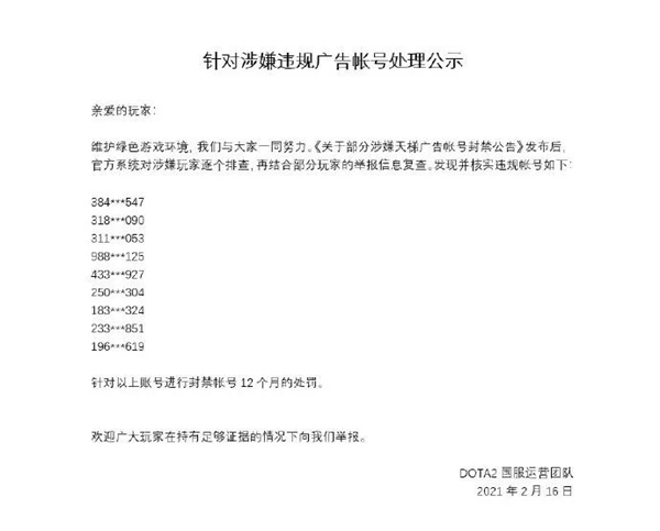 这个公告之后,DOTA2 官方微博也公示了两批被封号的名单,对这些账号进行了为期 12 个月的封禁。