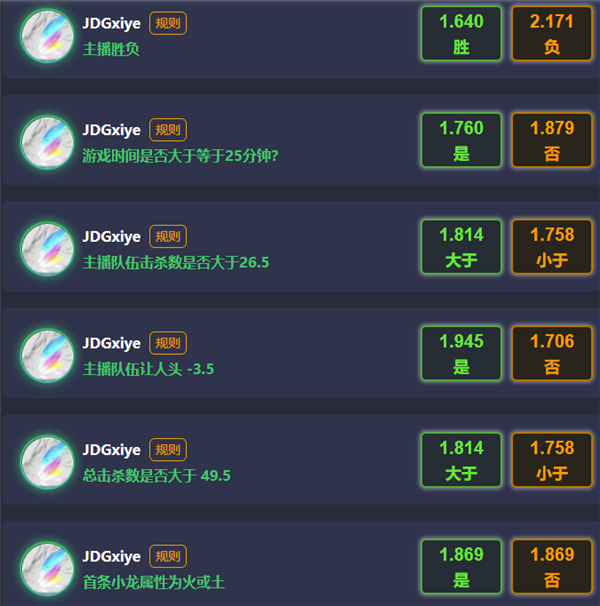 小比赛的人气有时候观看人数甚至还没大主播的单排高,因此一些博彩网站专门开设了针对主播的盘口供观众进行下注,包括但不限于 DOTA2 、英雄联盟、和平精英等热门游戏主播。至于下注的选项,则是五花八门,包括胜负、游戏市场、击杀人数等等。
