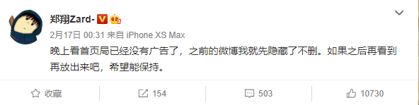 虽说完美世界对此事的回应已经算是相当迅速,并且带来的效果也不错,第二天首页局基本已经见不到广告的身影了,Zard 也选择了隐藏之前的微博。