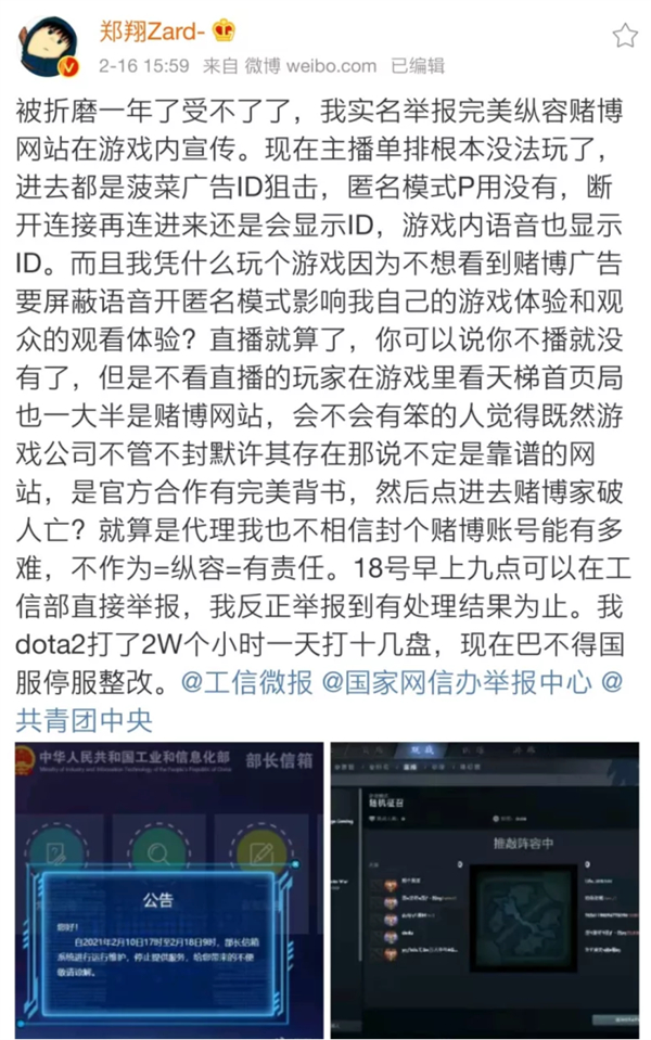 前两天,知名的 DOTA2 主播@郑翔Zard- 在一次游戏直播后发了一条长微博,引发了巨大反响,让他的搜索热度一下子来到了第五位。在这条微博里,他表示已经向工信部实名举报了 DOTA2 国内的运营商完美世界,理由是 “ 纵容赌博网站在游戏内宣传 ” ,为了这条微博能被重视起来,甚至还 at 了三个网络权威部门:工信部,网信办,共青团中央。
