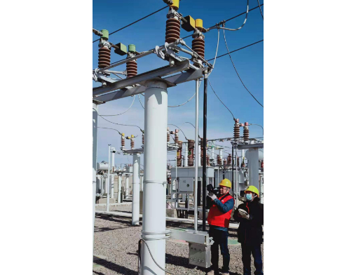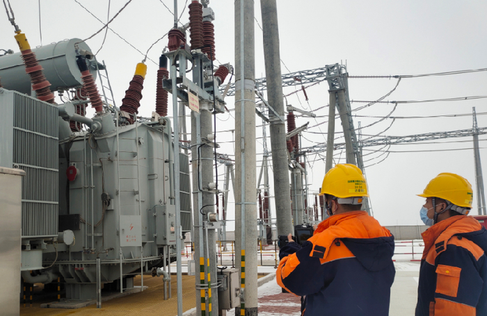 2月18日,甘肃酒泉金塔供电公司员工李红东、李桂玉在35千伏中东变电站为2号主变压器测温。(李红东 蒋丽娟)