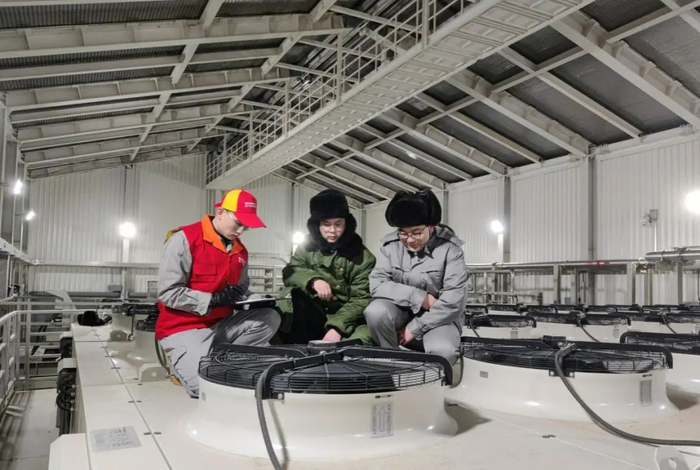 2月18日,冀北电力检修公司员工安海清、赵栋、廉田亮在±500千伏康巴诺尔换流站检查外冷系统风机。(陈学良)