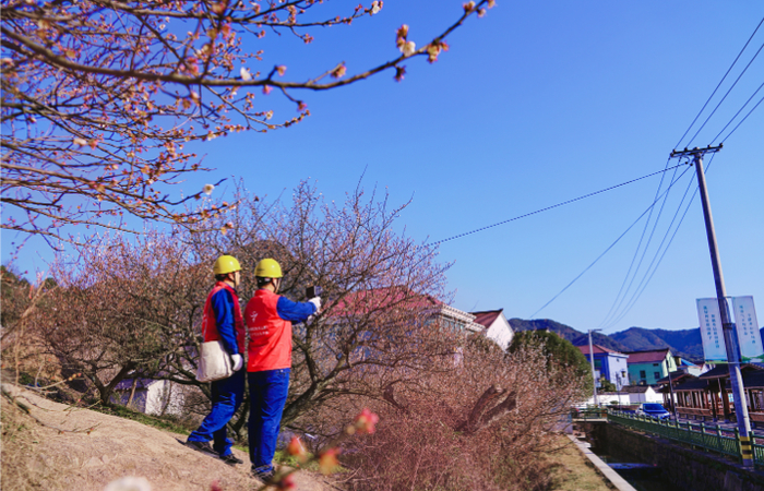 2月19日,浙江绍兴上虞供电公司员工樊志华、钱帅杰在丰惠东溪村为10千伏梅岙线112~119号杆测温。(任演清)