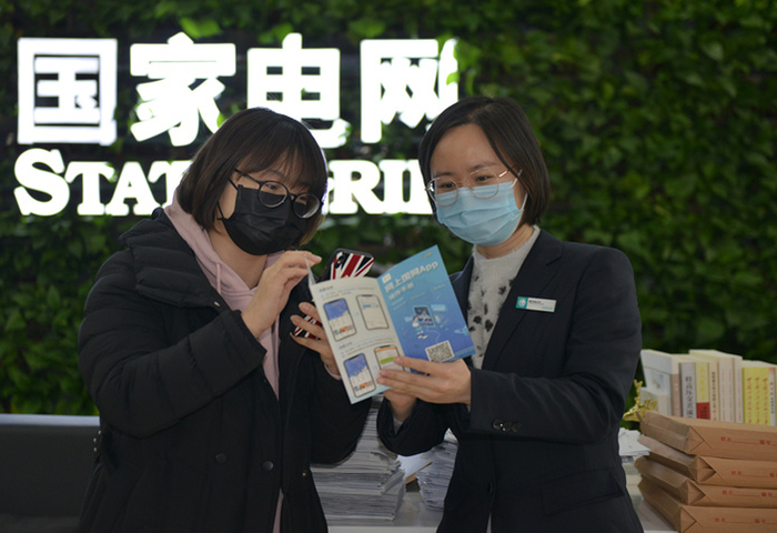 2月19日,冀北廊坊供电公司新华营业厅客户经理杨晓博为客户介绍“网上国网”客户端使用方法。(邹明)