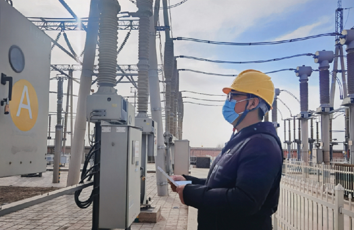 2月19日,宁夏电力检修公司员工鲁国栋在330千伏月牙湖变电站检查断路器六氟化硫压力值。(靳莹)