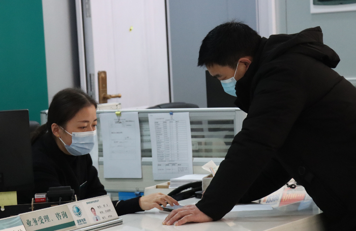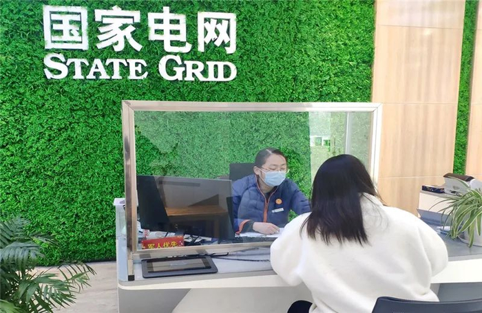 2月19日,江苏盐城射阳供电公司员工杨帆在人民东路营业厅为客户办理用电业务。(周雅雯 朱静)
