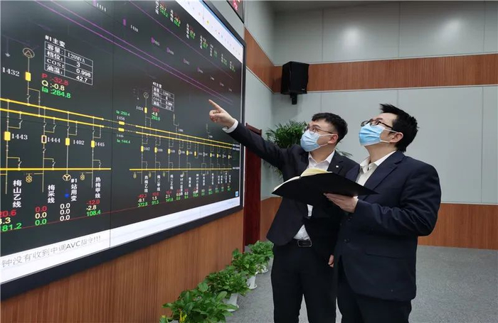 2月17日,吉林通化供电公司员工胡帅、宫在佺在调度大厅密切监视变电站负荷及潮流变化。(纪托)