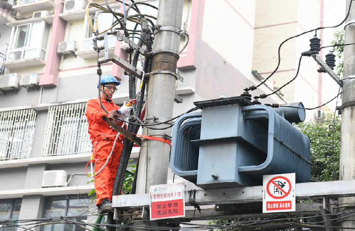 2月18日,重庆市北供电公司员工在380伏新牌坊邮政台区测量低压出线电压。(杨清)