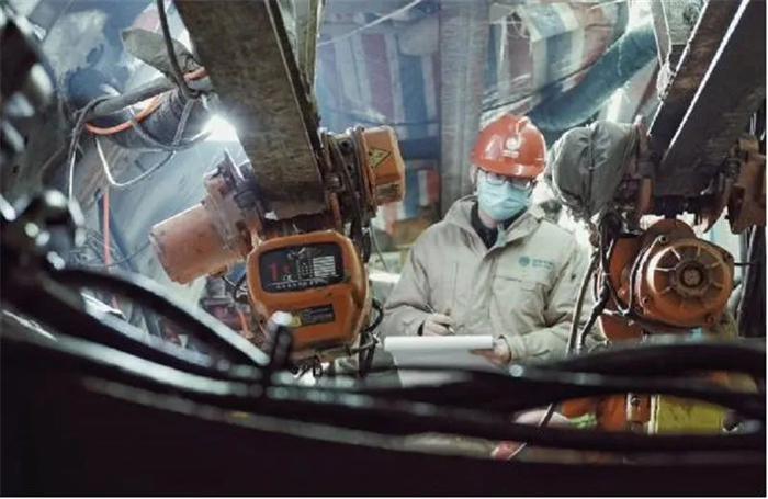 2月19日,天津电力建设分公司员工魏佳琪在220千伏延吉道变电站综合改造电源线工程2、3号井下检查盾构机管片拼装情况。(刘文静)