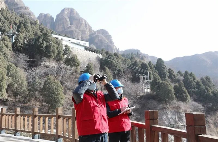 2月19日,河北保定易县供电公司员工杜冬云、程帅在狼牙山脚下巡视10千伏线路。(李正慧)