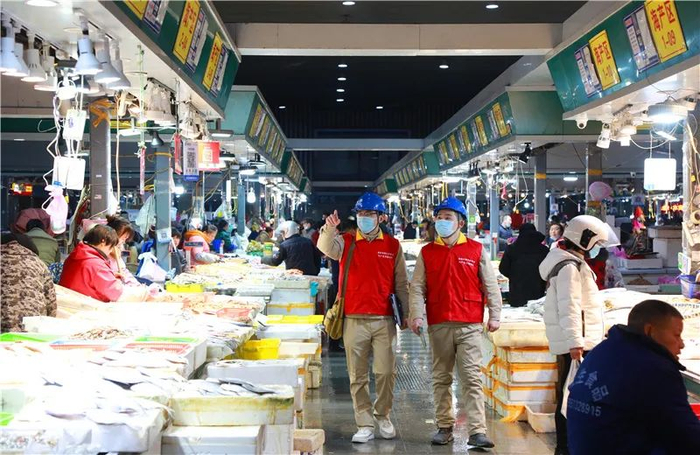 2月19日,江苏南通如东供电公司共产党员服务队队员蒋陈鸣、张亮在掘港镇中心农贸市场了解客户用电情况。(张浩)