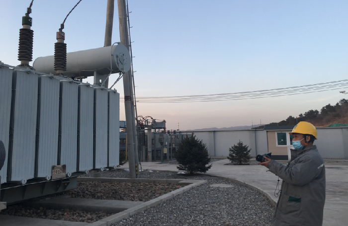 2月19日,冀北承德供电公司员工郑国新在110千伏六沟变电站为1号主变压器测温。(高静)