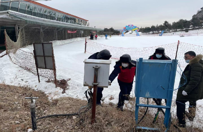 2月18日,吉林延边龙井供电公司员工金城辉、陈立彬在海兰江滑雪场为客户检查低压配电箱。(单喜鑫)
