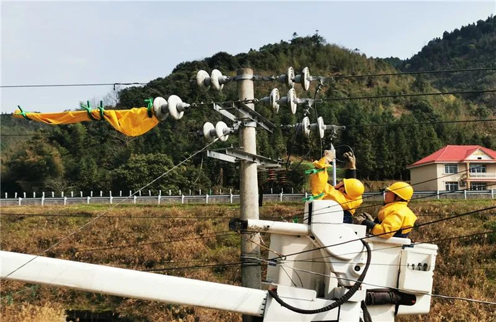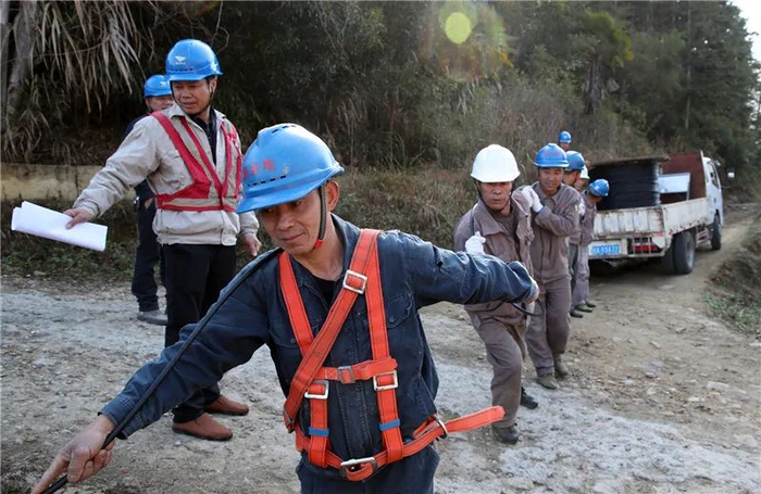 2月18日,福建南平浦城供电公司员工在浦城县临江镇井栏村10千伏大湖线6号杆下牵引导线。(李义友)