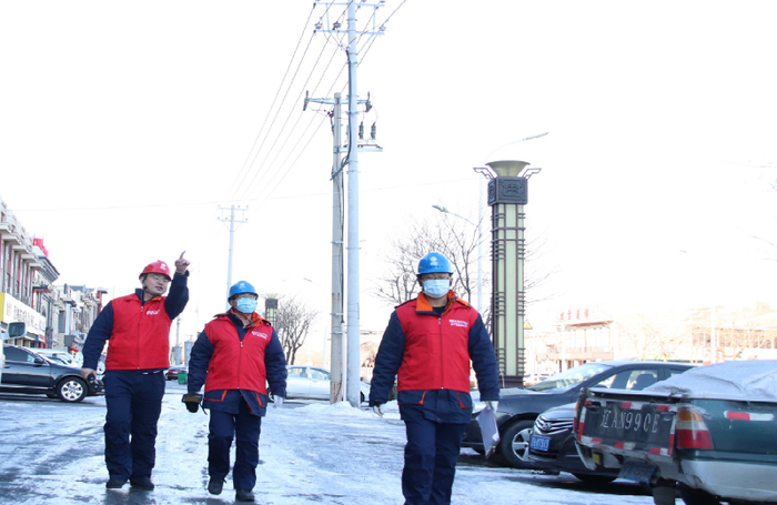 2月18日,辽宁营口供电公司员工在新兴大街巡视10千伏润毛线。(谢志丰)