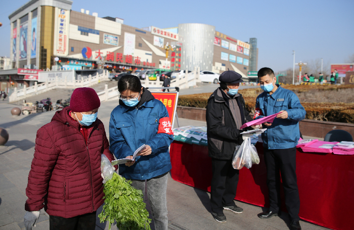 2月18日,山东临沂平邑供电公司员工任远、张浩芸在大润民广场向过往行人介绍安全用电知识。( 龙古月)