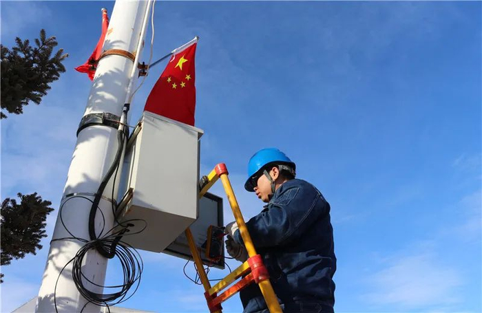 2月18日,蒙东呼伦贝尔伊敏供电公司员工徐美龙在文体活动中心检查当地公安监控系统设备电线连接情况。(王昕)