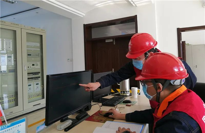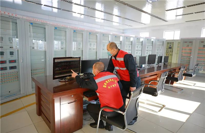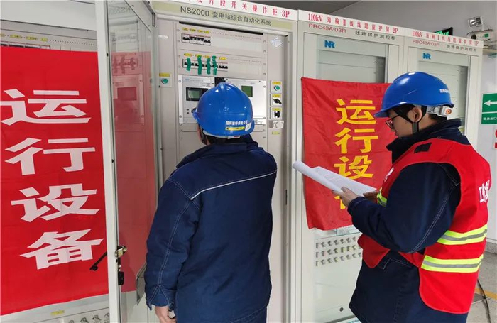 2月17日,陕西榆林供电公司员工蔡昕原、马楠兵在位于榆阳区金鸡滩镇的110千伏海流滩变电站调试备自投装置。(慕琦宇)