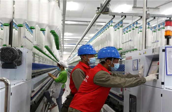 2月18日,湖北鄂州华容供电公司员工成忠荣、周秀飞在湖北枫树线业有限公司制纱车间帮客户检查用电设备。(郑瑶)