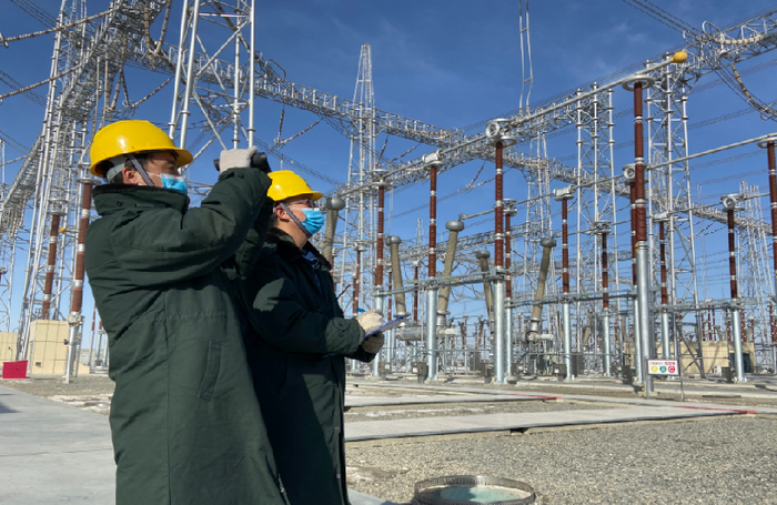 2月19日,新疆电力检修公司员工苏越、马欢在750千伏木垒变电站巡视设备。(杨杨)