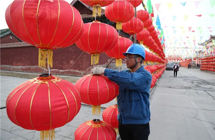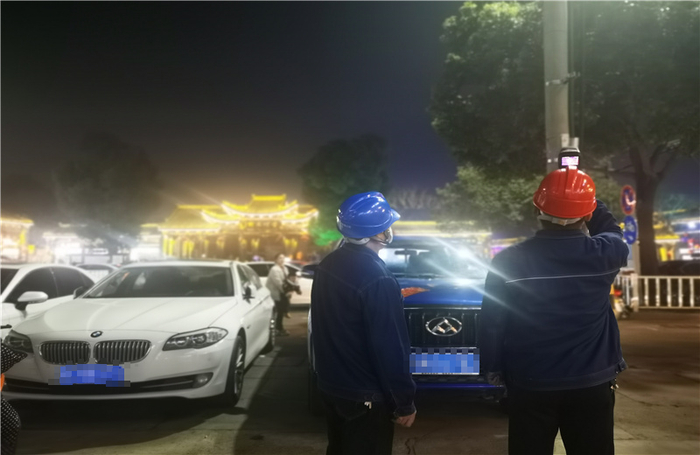 2月18日,山西长治潞城供电公司员工杨晓伟在府前广场元宵灯展现场检查安全用电情况。(李晓伟)