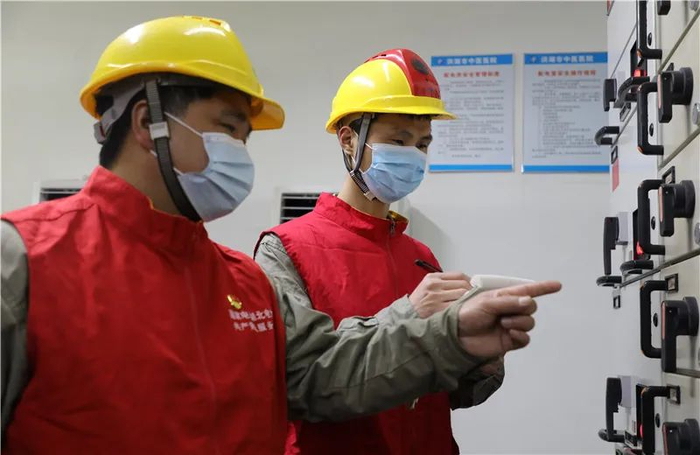 2月19日,湖北荆州洪湖供电公司“洪湖湖上”共产党员服务队队员在洪湖市中医院核酸检测临时电源点检查电源可靠性。(张金鑫)