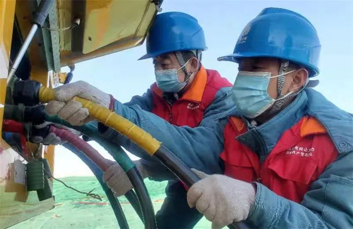 2月19日,山东淄博供电公司员工贾希宁、蒲先平在钟楼街道周家河村为山东云商智能制造产业园项目开工仪式安装应急电源。(贾锋)