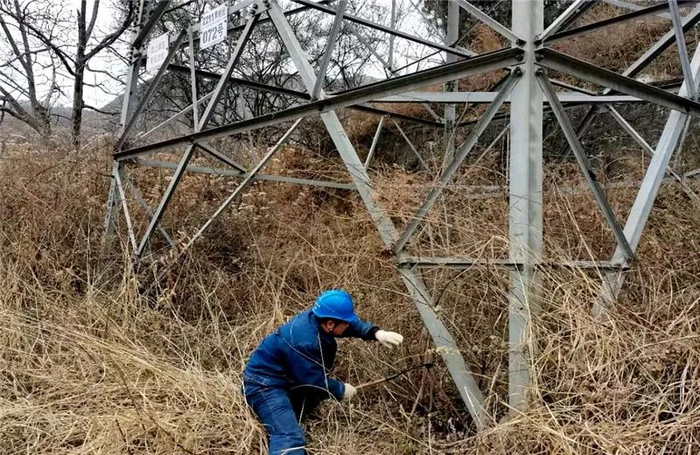 2月18日,甘肃陇南供电公司输电运检中心员工李军清理220千伏早成线072号塔基旁的杂草。(朱伟)