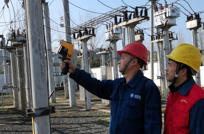 2月18日,湖南衡阳衡东供电公司员工李建国、赵煊在35千伏甘溪变电站为2号主变压器测温。(单银屏 贺亚琼)
