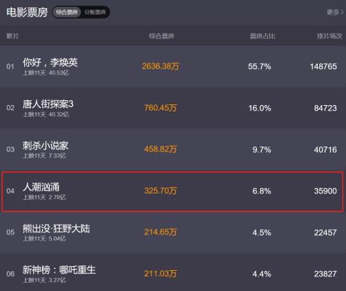 《人潮汹涌》导演饶晓志发声“求排片”后,影片的上座率持续上扬,累计票房已达到2.78亿元。