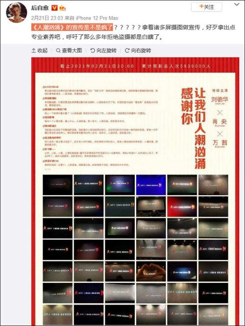 21日,《人潮汹涌》发布最新宣传海报,将微博网友观影中的摄屏图片制作成了合集。