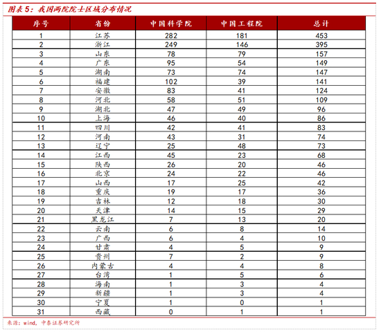 江浙地区院士人数远超其他地区,与经济发展水平、教育水平呈正相关。此外,山东、广东、湖南、福建、安徽、河北等地位列3-8位,分别为157、149、147、141、124、109人,同样为院士出产大户。相比之下,籍贯为广西、甘肃、贵州、内蒙古、台湾、海南、新疆、宁夏、西藏等省份的院士在10人和10人以下,表明我国院士区域分布还很不均衡,如贵州两院院士共计只有9名,是江苏的1/50。