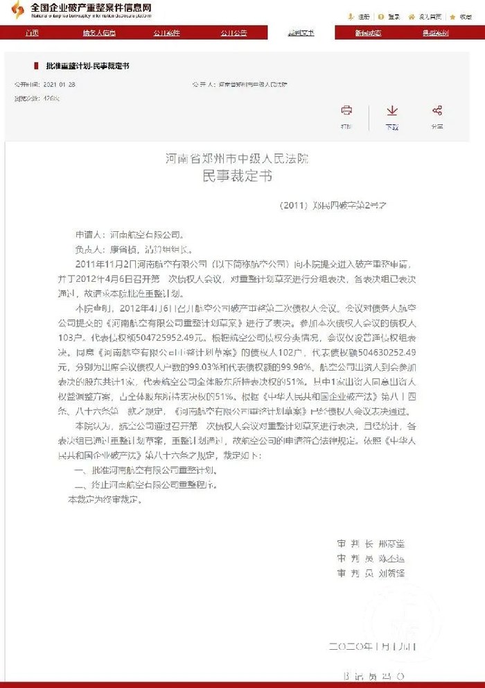 郑州中院民事判决书披露,2011年11月2日,河南航空向郑州中院提交进入破产重整申请,并于2012年4月6日召开第二次债权人会议,对重整计划草案进行分组表决,各表决组已表决通过,故请求郑州中院批准重整计划。