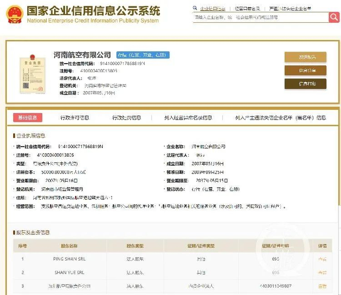 上游新闻查询国家市场监督管理总局国家企业信用信息公示系统获悉,截至目前,河南航空有限公司的照面名称(工商执照上的名称)仍然为“河南航空有限公司”,法定代表人为张沛,深圳航空、平山公司、山岳公司仍然为河南航空的股东。目前距裁定下达已经超过了4个月,但河南航空的工商注册股东信息仍未变更,这也给河南航空的重整增添了些许变数。
