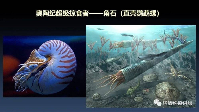 寒武纪接下来是奥陶纪,当时陆地上还没有那么多生命,海洋中的超级掠食者就变成了它的史前近亲——角石,也就是直壳的鹦鹉螺。