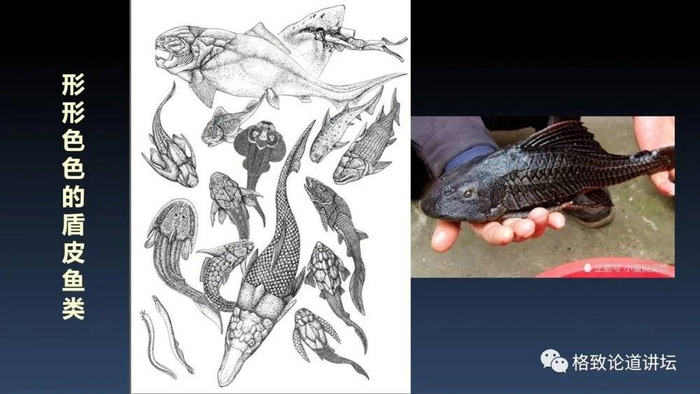 盾皮鱼类是一个分异度非常大的类群,里面有形形色色的种类,大部分长得和旁边的甲鲶,也就是现代的一类鲶鱼非常相像。