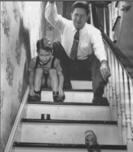 他把这份快乐和邻居家的小孩儿一块分享:把弹簧顶端放在一级台阶上,末端放在下一级台阶上,然后松开顶端,弹簧立即不紧不慢地翻着筋斗,“走”下了楼梯!