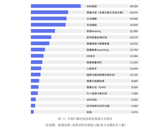 目标检测、图像分割、文本理解、目标跟踪仍为计算机视觉人才未来研究的重点方向,同时医学影像处理识别的研究兴趣排名由第 7 位上升到第 5 位,这可能与新冠疫情后医疗领域计算机视觉相关需求骤增有关。