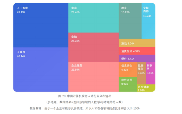 人工智能和互联网企业计算机视觉人才最多,也有大量计算机视觉人才分布在电商、金融、企业服务、教育、文娱内容等领域,这主要由于计算机视觉技术在部分行业的发展中承担着越来越重要的角色。